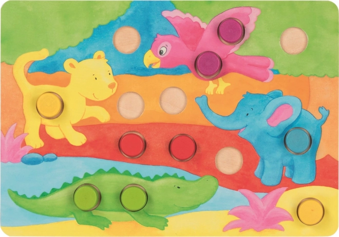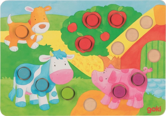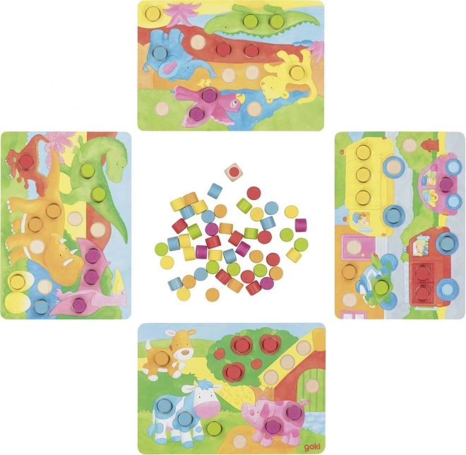 Ta vstavljanka GOKI otrokom prinaša zabavo in hkrati učenje. Otroci se naučijo prepoznavati in vstavljati barvne kamenčke v slike. Igra vključuje:
