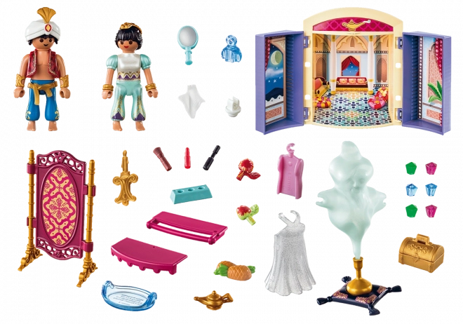 - 1x figura orientalskega princa, 1x figura princese, čudežna svetilka, skrinja in drugi dodatki, zaprt igralni kovček