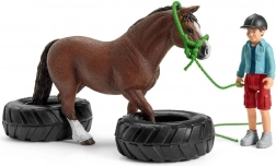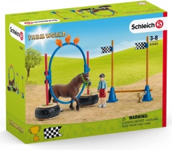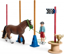 Pripravite svojega valižanskega ponija na tekmovanje v agilityju in preverite, ali lahko samozavestno premaga vse ovire. Ta komplet vključuje vse, kar potrebujete za realistično izkušnjo treninga, vključno s figurico dečka, jahalno čelado in ovirami s zastavicami start-cilj. Detajli so značilni za Schleich in približujejo življenje na podeželju.