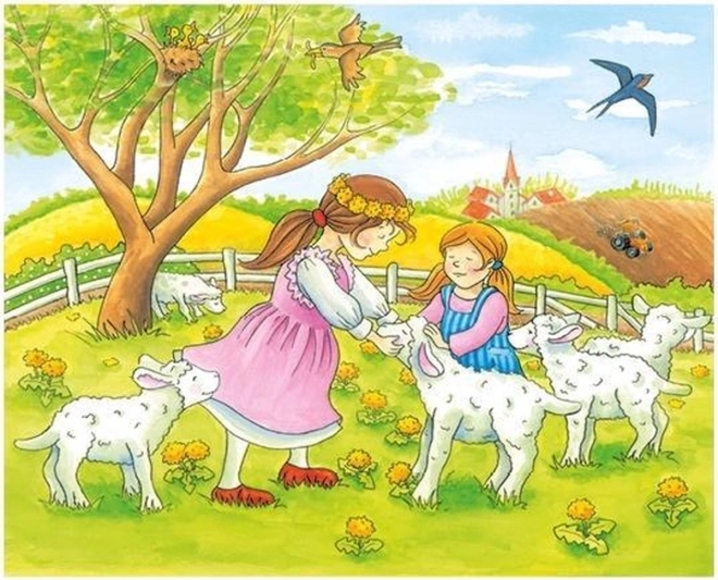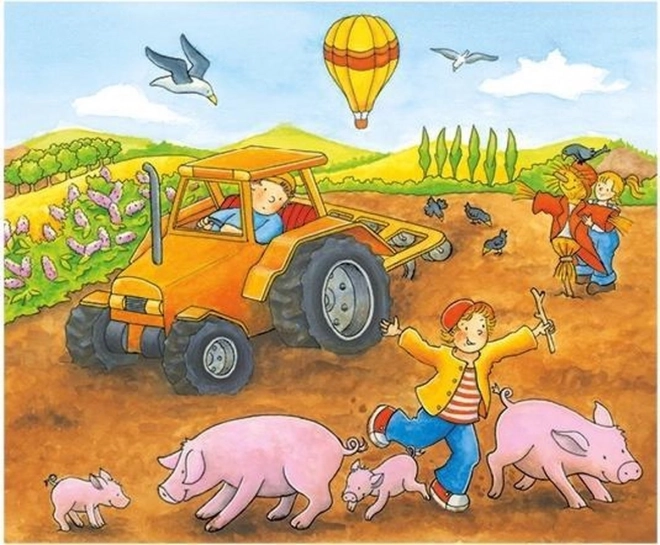 Sestavite prizore s traktorjem, otroki in živalmi. 12 kock ustvari 6 celotnih slik in uri zaznavanje oblik, barv ter logično sestavljanje.