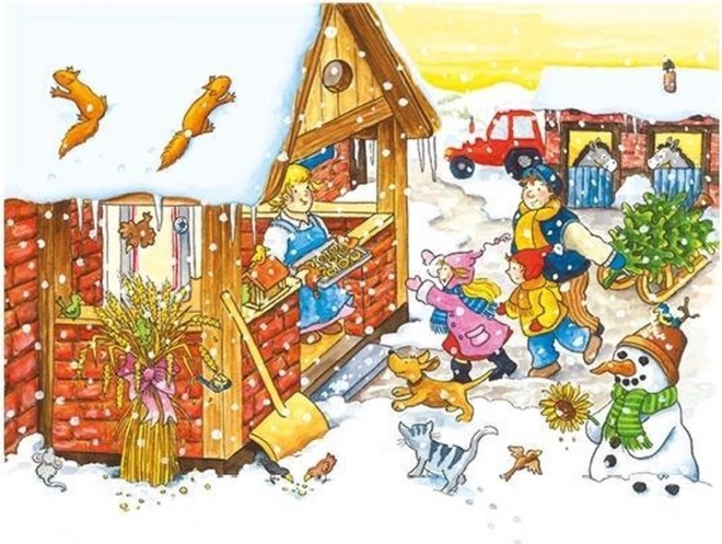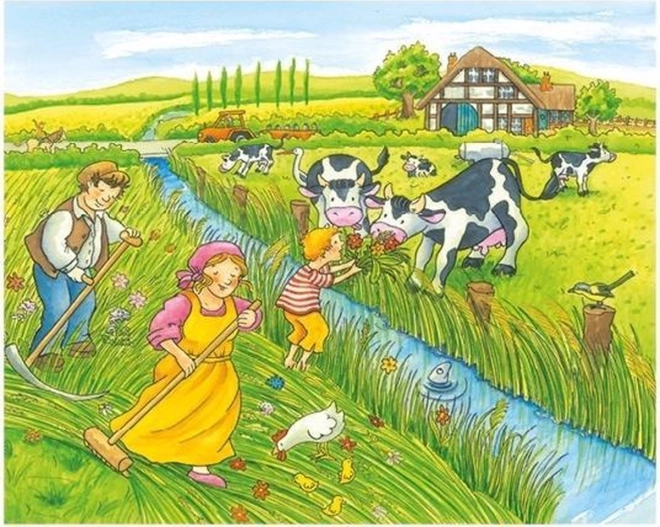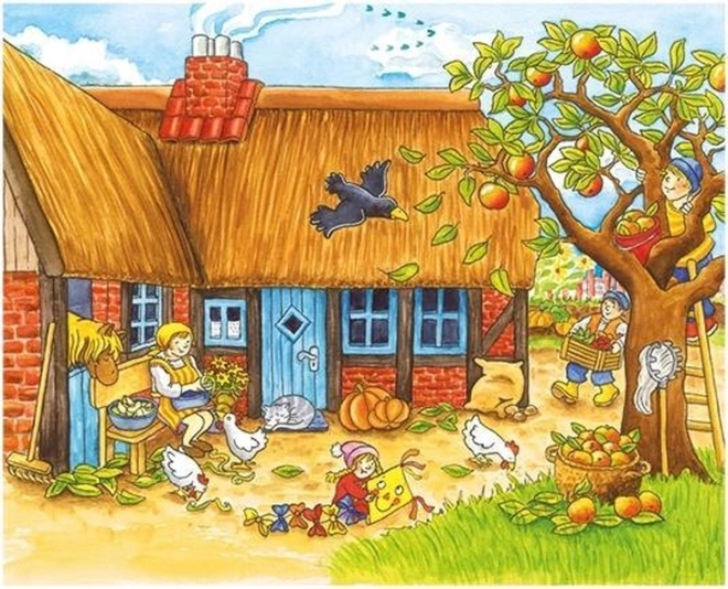 Odkrijte podeželski svet z živalmi in ljudmi skozi vse leto. Iz 12 trdnih lesenih kock sestavite 6 ilustriranih prizorov – od spomladanskega dvorišča prek poletnih opravil do zimskih radosti. Kocke so idealne za predšolske otroke, razvijajo koordinacijo oko–roka in učijo otroke zaznavati odnos delov do celote.