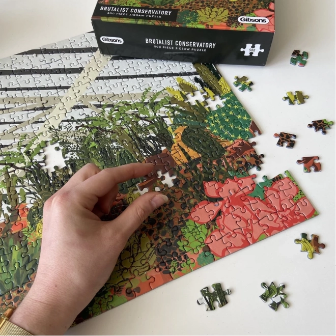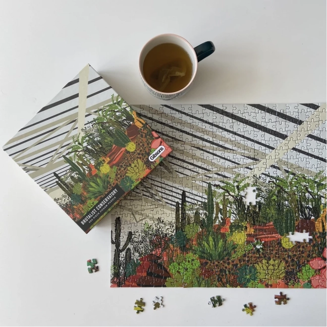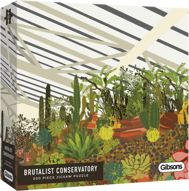 Odkrijte čar mestne džungle s sestavljanko znamke GIBSONS. Ilustracija prikazuje zimski vrt v londonskem Barbicanu s tropskimi rastlinami, listavci in kaktusi. Sestavljanje 500 koščkov ponuja relaksacijsko izkušnjo, kakovostno izdelavo in priloženo predlogo v pakiranju za lažje sestavljanje.