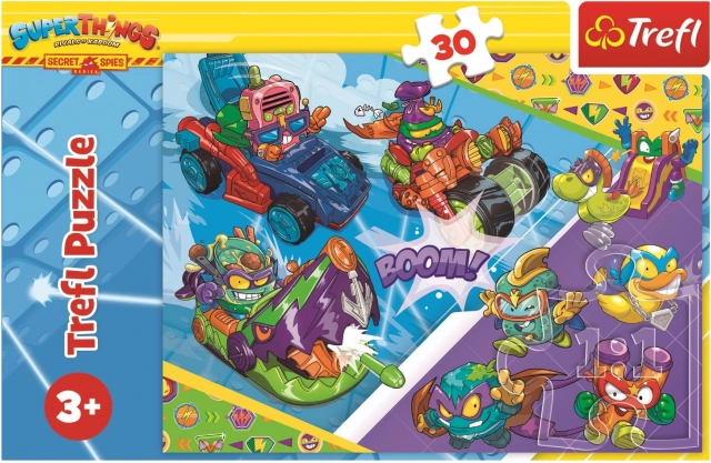 Otroška sestavljanka z motivom SuperThings: ekipa super vohunov prinaša zabavo in razvoj veščin za najmlajše. Vsebuje 30 koščkov, priporočeno od 3 let, po sestavljanju meri približno 27 × 20 cm – idealno za prve poskuse sestavljanja ter vadbo fine motorike in zbranosti.