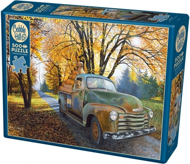 Sestavljanka COBBLE HILL Vesela vožnja s 500 koščki vas popelje na mirno jesensko pot s starodobnikom, naloženim z bučami, in zvestim pasjim spremljevalcem. Zaradi nepravilnega izreza, ki ne sledi standardni mreži, je sestavljanje zabavnejše in hkrati zahtevnejše – idealno za vse, ki iščejo nekaj več kot le klasično sestavljanko.
