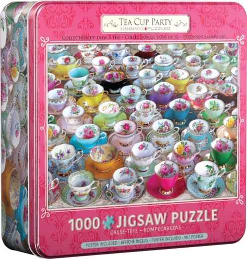 Sestavljanka EUROGRAPHICS 1000 kosov v embosirani kovinski škatli. Posebno oblikovani koščki, samostojna predloga in dekorativni motiv Zbirka čajnih skodelic.