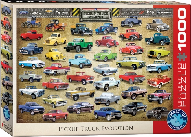 Odkrijte stilno sestavljanko z motivom razvoja pick-upov znamke EUROGRAPHICS s 1000 kosi. Poseben nekonvencionalen izsek z netipičnimi oblikami koščkov poveča težavnost in prinaša daljše ter zabavnejše sestavljanje. Napisi na sliki so v angleščini. Velikost po sestavi približno 67,63 × 48,89 cm.