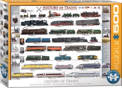 Ta sestavljanka z motivom Zgodovina vlakov predstavlja pregled ikoničnih lokomotiv in garnitur iz različnih obdobij. Zahvaljujoč večjim XL kosom je sestavljanje udobno tudi za začetnike ali družine z otroki, končna slika z merami približno 67,63 × 48,89 cm pa izstopa na vsaki steni.