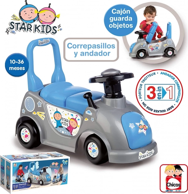 Odkrijte vsestranski poganjalec CHICOS Star Kids 3v1 v igrivem modro-sivem dizajnu z vesoljskimi motivi. Služi kot hodulja za prve korake, nato kot poganjalec za razvoj koordinacije in ponuja tudi shranjevalni prostor za drobnarije pod sedežem. Kakovostna, odporna plastika in premišljena konstrukcija zagotavljata udobno in varno uporabo vsak dan.