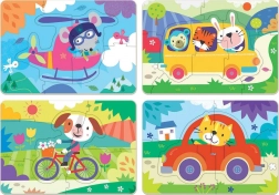 Ta komplet vsebuje štiri samostojne sestavljanke velikosti 24 x 16 cm z različno številom koščkov (od 5 do 8), ki postopoma izpopolnjujejo otrokove spretnosti pri sestavljanju in povečujejo zahtevnost. Vsaka sestavljanka omogoča samostojno odstranitev in sestavljanje celotnega prevoznega sredstva, kar spodbuja razvoj motorike in logičnega mišljenja pri otrocih.