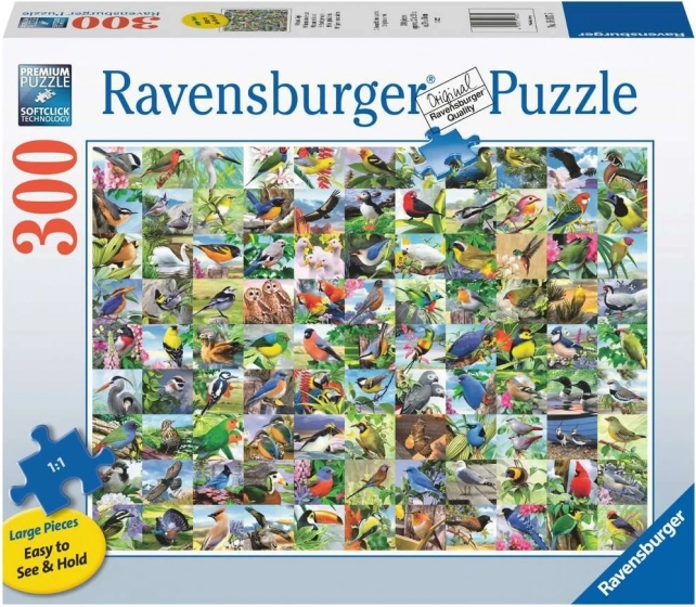 RAVENSBURGER 2D sestavljanka, velik format – 99 očarljivih ptic, 300 koščkov. Antirefleksna površina, SoftClick in vrhunska kakovost za otroke in odrasle.