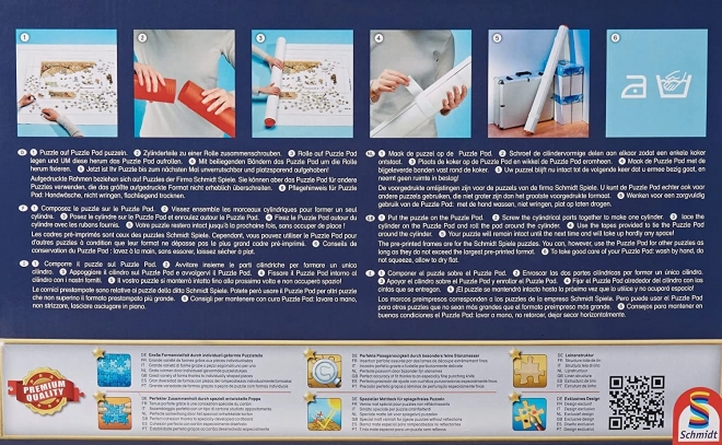 Imate otroke? Ali hišne ljubljenčke? Ali premalo prostora? Praktična podloga, ki jo preprosto zvijete skupaj z razporejeno sestavljanko, je idealna za prihranek prostora in shranjevanje vaših puzzlov. Podloga je primerna za sestavljanke do velikosti 137 x 100 cm (ustreza 3.000 koščkom večine proizvajalcev). Preproga za sestavljanke je idealna za prihranek prostora in varno shranjevanje nedokončane ali dokončane slike. Podloga zagotavlja varno shranjevanje ali prenašanje vaše sestavljanke. Sestavljanka se sestavlja neposredno na preprogi in ko jo želite pospraviti, privijete skupaj dva dela plastične cevi in preprogo s sestavljanko nanjo navijete. Nato jo trdno pritrdite s priloženimi trakovi ter varno shranite na primer pod posteljo ali na omaro. Podloga za sestavljanke blagovne znamke SCHMIDT ima to prednost, da so na njej predtiskani obrisi sestavljank SCHMIDT (500–3000 koščkov), zato lahko že pri sestavljanju robov natančno umestite sestavljanko. Opomba: Na SCHMIDT-ovi vrtljivi podlagi lahko seveda sestavljate tudi sestavljanke drugih blagovnih znamk, če njihova velikost ne presega dimenzij podloge, pri čemer je treba upoštevati primeren robni presežek. Vsebina pakiranja: podloga dimenzij 137 x 100 cm, plastični valj in 3 trakovi. Prikazana sestavljanka ni del pakiranja. OPOZORILO: V primeru nakupa preproge za sestavljanje sestavljank drugih blagovnih znamk priporočamo preveriti dimenzije sestavljene sestavljanke. Vzdrževanje filcane podloge: Podlogo je mogoče likati na najnižji temperaturi, najbolje preko tanke tkanine (krpe). Ročno pranje v hladni vodi, ne ožemati in ne sušiti v sušilnem stroju.
