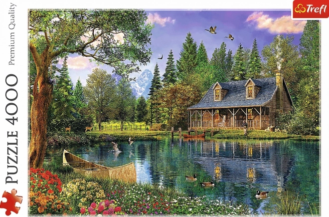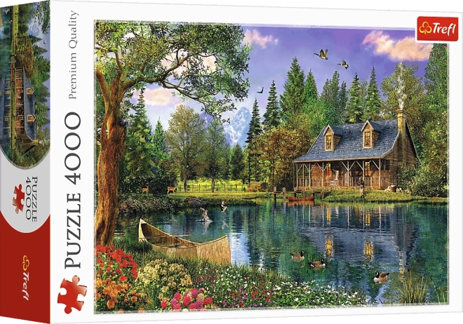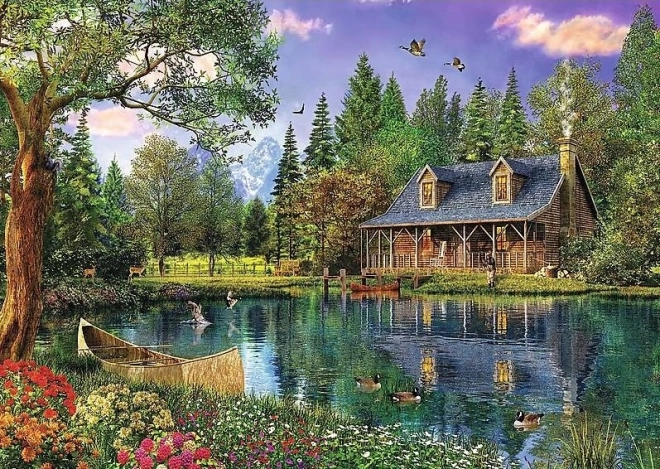 Uživajte v mirnem vzdušju narave z velikoformatno sestavljanko, ki prikazuje leseno kočo ob mirnem jezeru, obdano z drevesi in divjo naravo. Po sestavitvi nastane podrobna slika dimenzij 136 × 96 cm – idealna za uokvirjanje in okrasitev notranjosti.