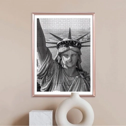 Podroben posnetek glave in krone Kipa svobode izstopa zaradi kontrasta in preciznega tiska – idealno za ljubitelje oblikovanja in fotografije.