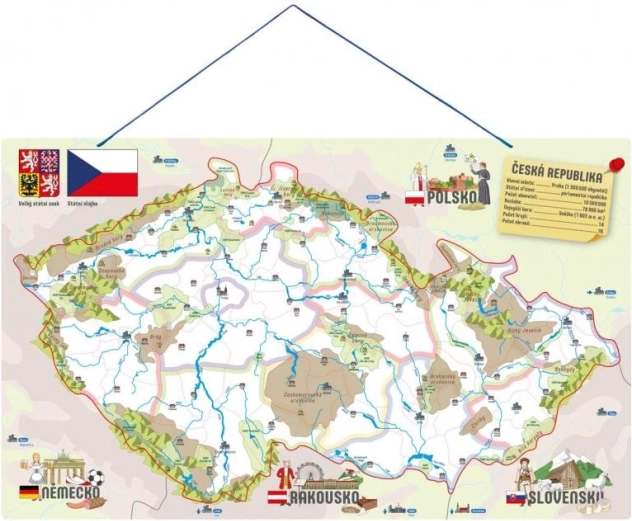 Odkrijte zabavno in izobraževalno pripomoček za otroke – magnetni zemljevid Češke republike 3 v 1, ki združuje učni puzzle, šolski pripomoček in družabno igro. Otroci si na igriv način osvojijo okraje in njihova mesta, spoznajo reke in gorovja in zahvaljujoč ilustracijam zlahka razumejo, kaj je značilno za posamezne regije. Del kompleta je tudi zabavna igra za urjenje pozornosti in zaznavanja.