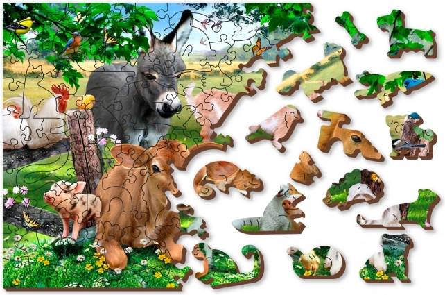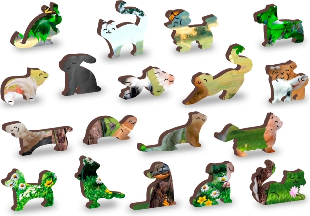 Koščki so lasersko izrezani v oblike živali in predmetov, kar povečuje estetsko vrednost in zanimivost sestavljanja.