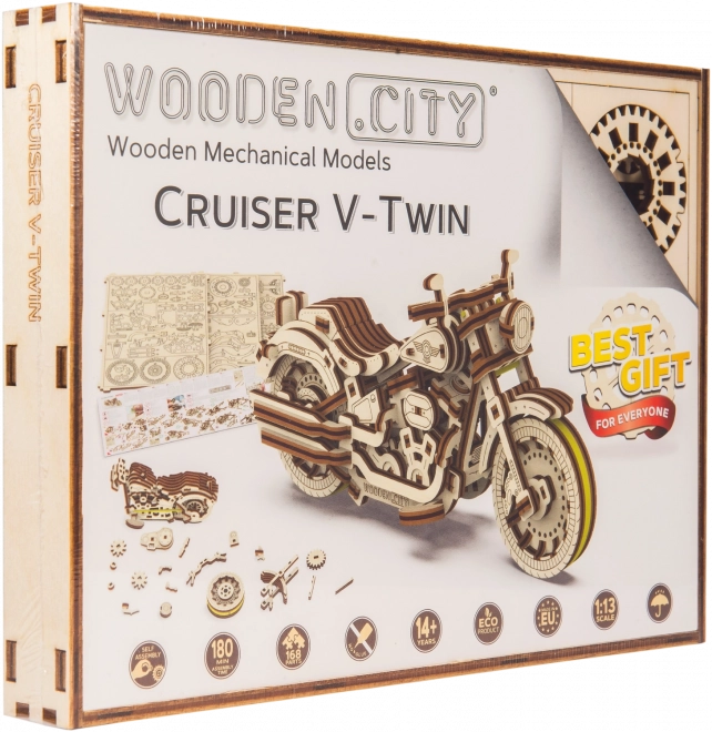 V modelu so prisotni detajli pravega motocikla: - funkcionalno stojalo, - smernik, - registrska tablica, - odsevniki, - vzvratna ogledala. 3D sestavljanka WOODEN CITY Cruiser V-Twin bo najboljše darilo za vsakega ljubitelja motociklov.