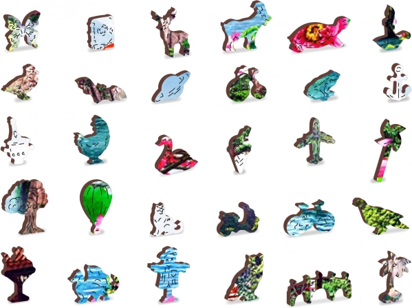 Vsak izmed 2000 kosov je izrezan z laserjem in mnogi med njimi imajo obliko živali, stavb ali drugih objektov, zaradi česar so posamezni kosi edinstveni in razvijajo otroško domišljijo in ustvarjalnost. Lesena sestavljanka je primerna za vse generacije in je odlično darilo.