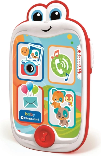 Interaktivni pametni telefon CLEMENTONI BABY je otroška igrača, navdihnjena s pametnimi telefoni za odrasle. Ponuja množico svetlobnih in zvočnih dražljajev, ki spodbujajo raziskovanje in podpirajo prvo učenje skozi igro. S štirimi velikimi gumbi in glasbeno tipko si otroci zlahka predvajajo melodije in glasove treh živali – kužka, muce in ptička.