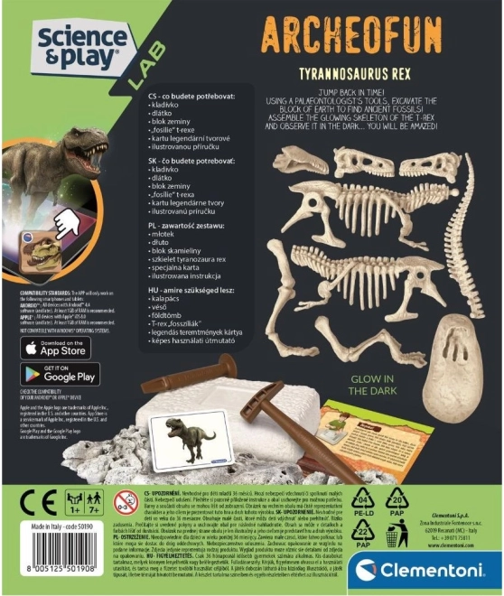 Odkrijte svet prazgodovine z Archeo Fun: Tyrannosaurus rex znamke CLEMENTONI. V bloku »kamnine« boste našli dele okostnjake T‑Rexa iz fluorescentnega materiala, ki po osvetlitvi sveti v temi. Komplet je zasnovan tako, da je zabaven in hkrati izobraževalen – otroci izvedo, kako nastajajo fosili in kako so živeli prazgodovinski plazilci.