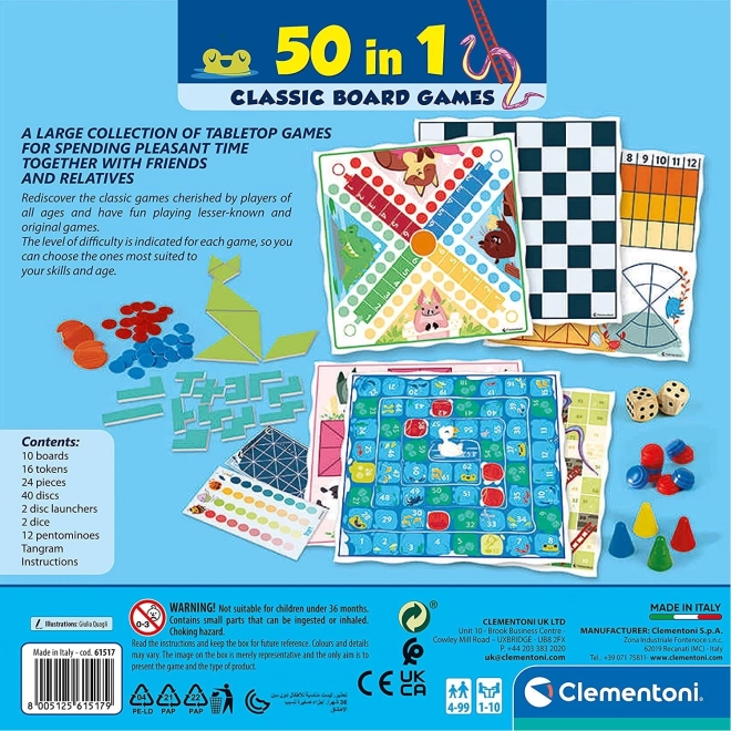 Škatla polna zabave za vso družino! Ta univerzalni komplet ponuja 50 različnih namiznih iger na 5 dvostranskih igralnih ploščah, za otroke in odrasle. Vsebuje vse potrebno za hiter začetek, navodila v CZ/SK/PL/HU in igre z različnimi stopnjami težavnosti. Odlično darilo za skupne trenutke.