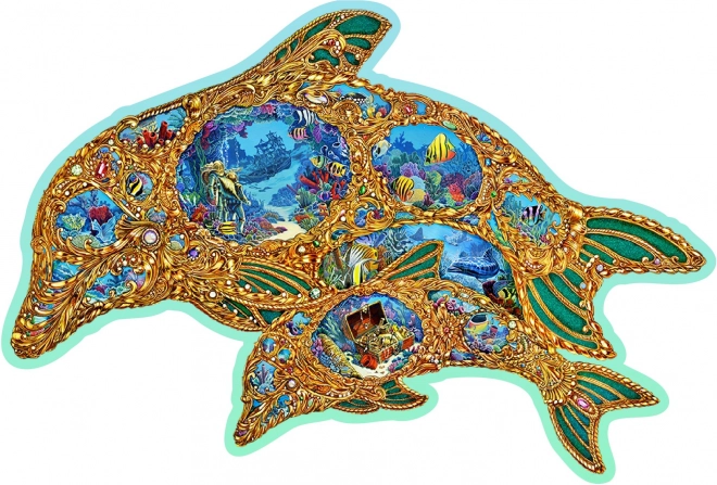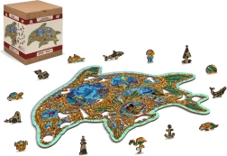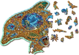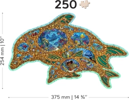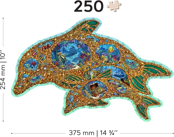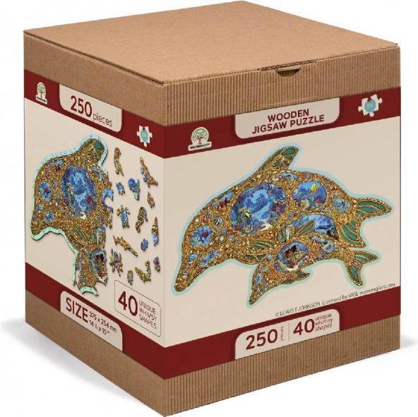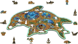 Privoščite si izvirno zabavo z lesenimi puzzli v obliki delfina, navdihnjenimi s podmorskim svetom. Zaradi posebej oblikovanih koščkov – del katerih ima podobo morskih živali – je sestavljanje vizualno privlačno in hkrati zahtevnejše kot pri klasičnih puzzlih. Z laserjem poudarjeni detajli motivu dodajajo globino, nekatere koščke pa lahko postavite kot drobne figurice.