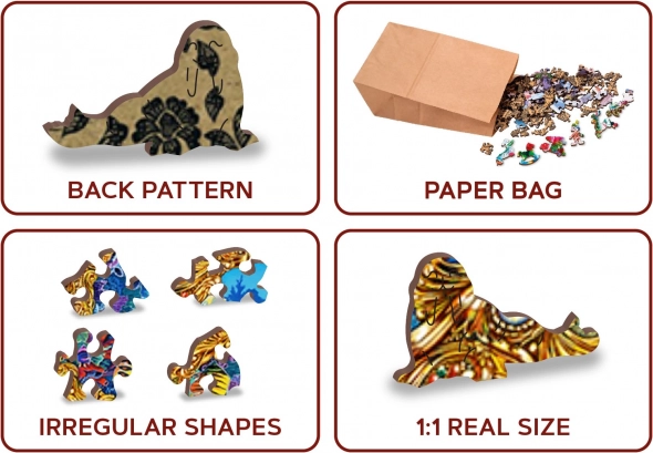 Vsak košček je izrezan iz čvrste HDF plošče debeline 3–4 mm, kar zagotavlja dolgo življenjsko dobo in udobno sestavljanje brez trsk. V paketu najdete tudi samostojen predlog za lažjo orientacijo. Trajnostni pristop znamke WOODEN CITY pomeni 100% eko embalažo brez plastike – puzzle so shranjene v papirnati vrečki in škatli.
