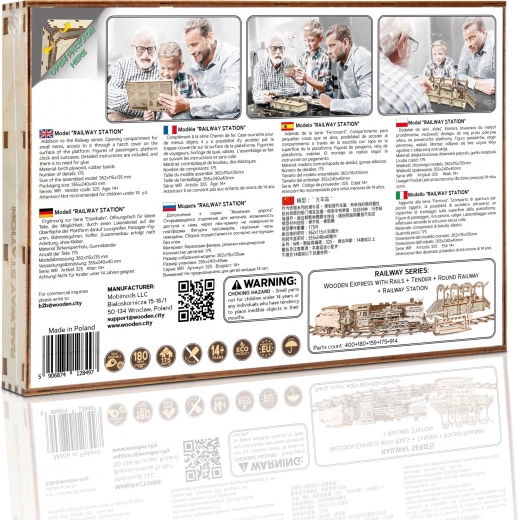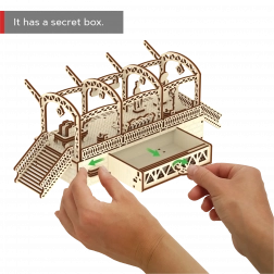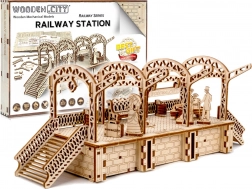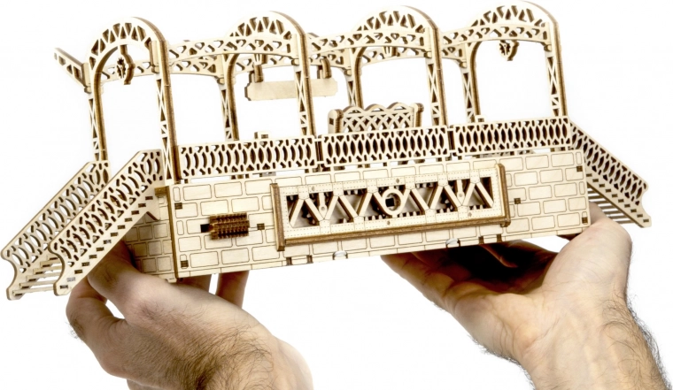 Lesene 3D sestavljanke WOODEN CITY železniška postaja prinašajo avtentično atmosfero postaje z dekorativnimi loki, klopmi in figuricami potnikov. Sestavljanje poteka brez lepila ali orodja, posamezni deli se natančno prilegajo, končni model pa je ne le dekorativen, temveč tudi funkcionalen – drobnarije preprosto skrijete v skriti predalček.