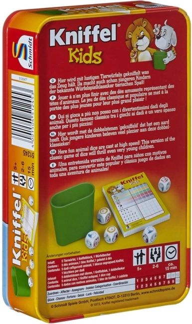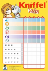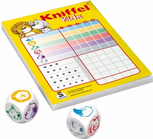 Kniffel Kids je priljubljena družinska igra v otroški različici, ki razvija opazovanje, logiko in osnovno računanje. Igralci mečejo kocke z živalmi, skušajo sestaviti čim ugodnejše kombinacije in rezultate zapisujejo v priloženi blok. Zahvaljujoč trdni kovinski škatlici je igra odlična za izlete, počitnice in tudi za v restavracijo.