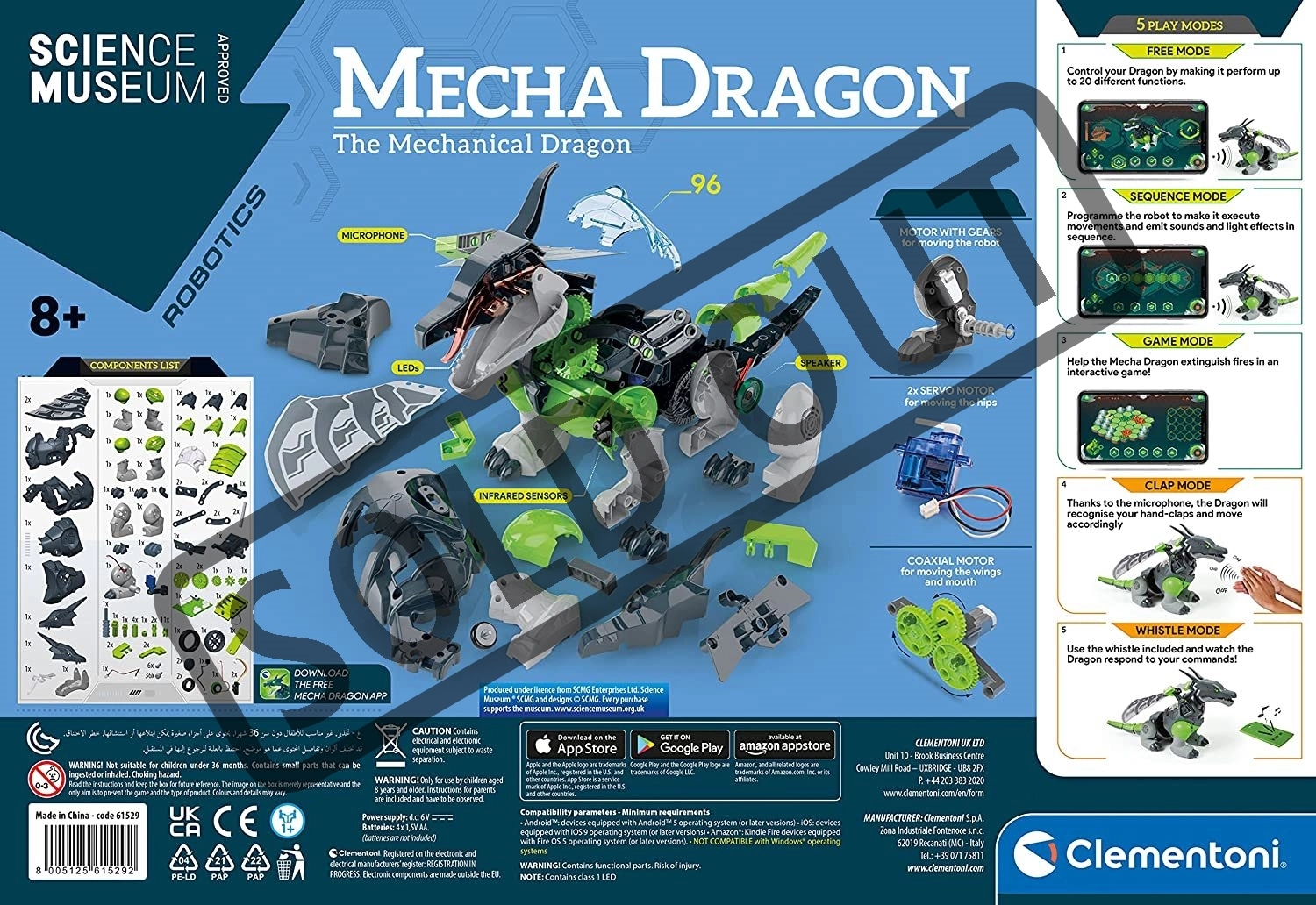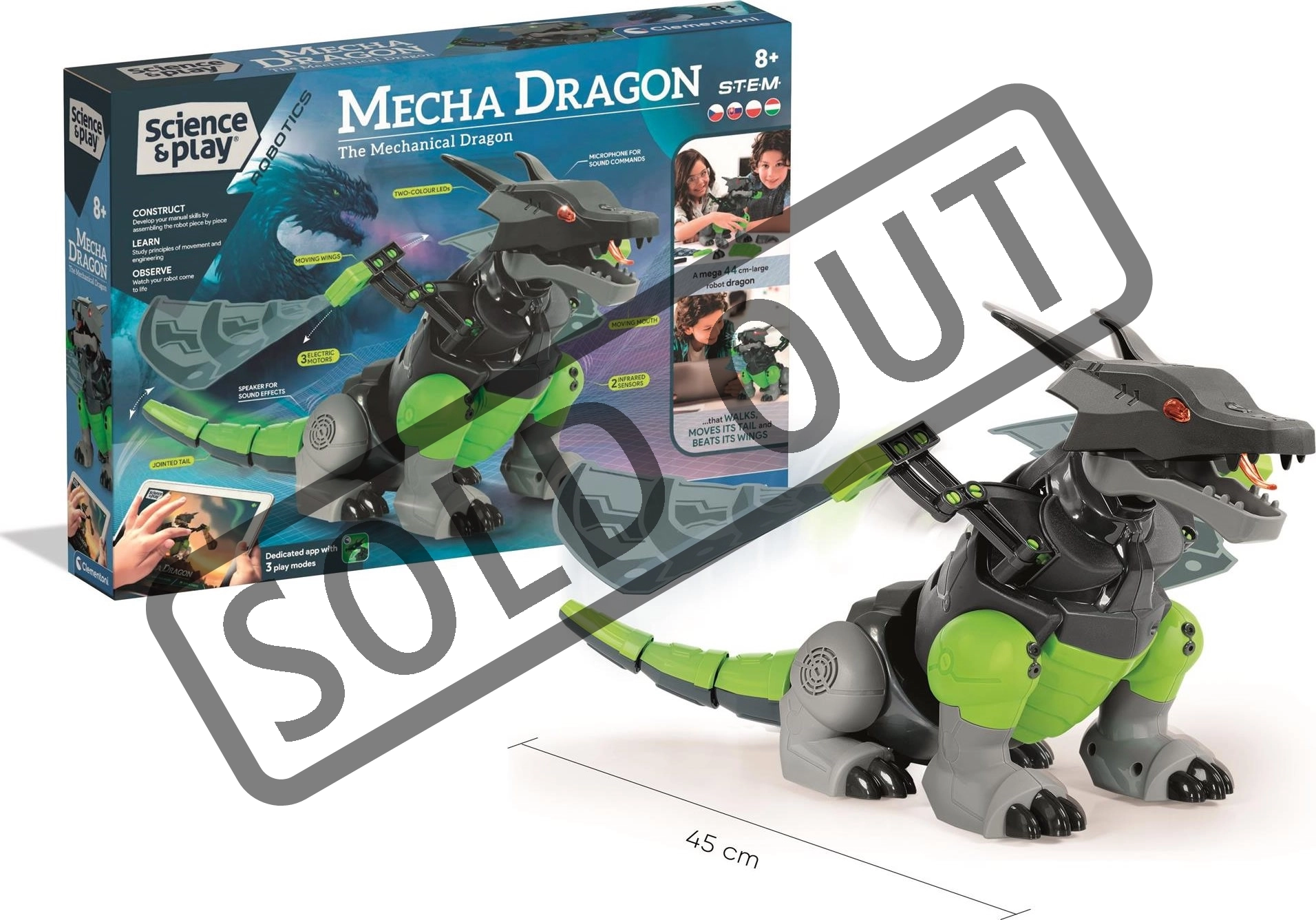 Odkrijte fascinantni svet robotike z interaktivnim zmajem CLEMENTONI Science & Play Robotics: Mecha Dragon. Ta 44 cm dolg mehanski prijatelj je opremljen s senzorji in 3 motorji, zaradi katerih hodi, maha s krili, premika rep in odziva na otroke. Upravljanje poteka prek mobilne aplikacije, infrardečih senzorjev, piščalke ali ploskanja. Odlična STEM igrača, ki spodbuja logično razmišljanje, ustvarjalnost in tehnične veščine.
