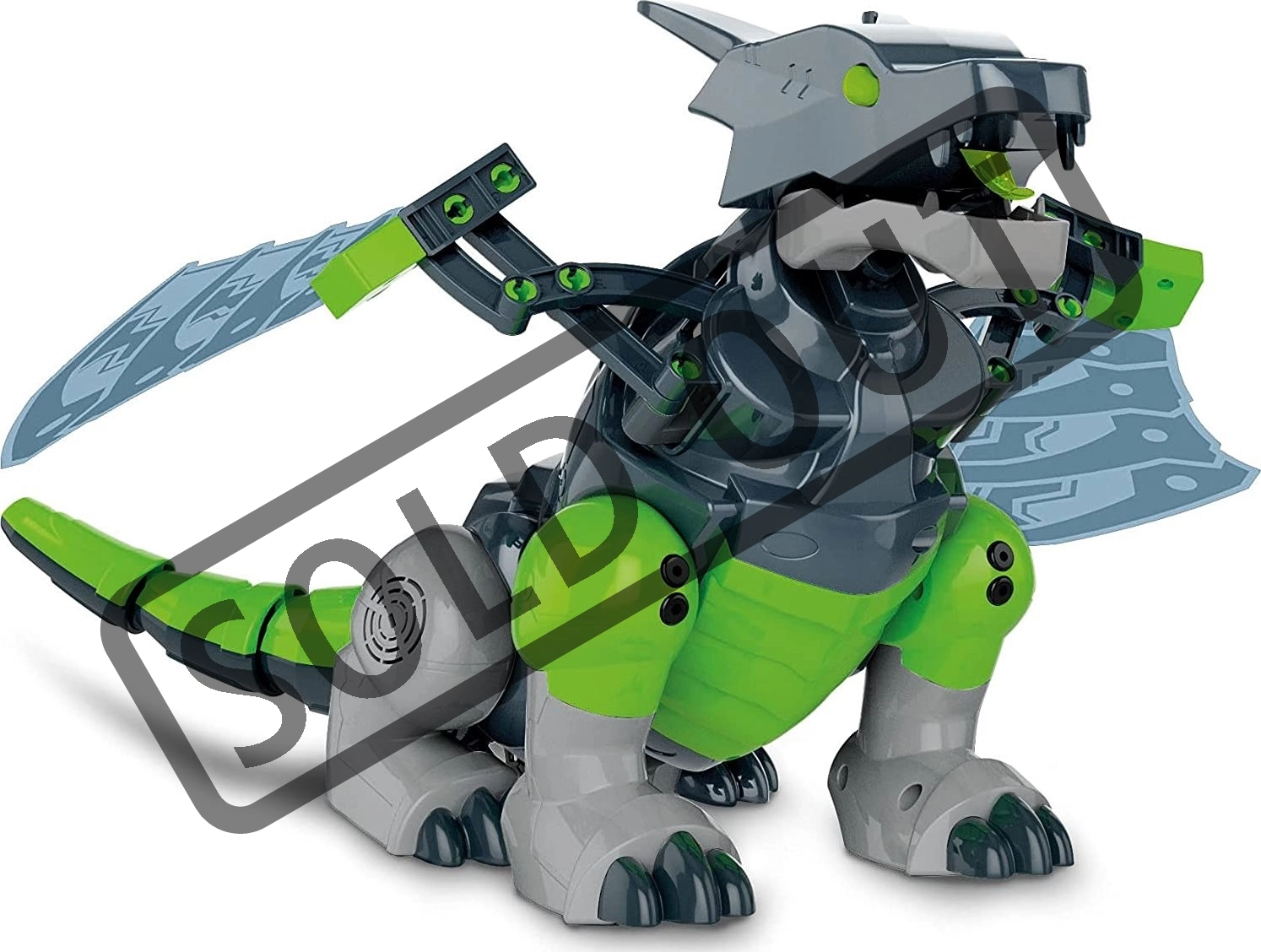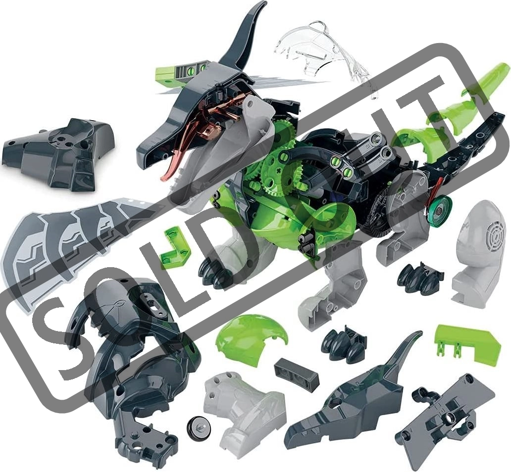 - Robustna konstrukcija: 96 delov, 3 motorji (2 za krila in čeljust, 1 servomotor za pogon in sklep telesa).
