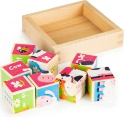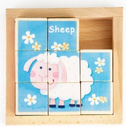 Ta set 8 trdnih lesenih kock ECOTOYS prinaša ure smiselne zabave. Otroci lahko iz njih sestavijo 3 prikupne slike – ovco, kravo in mačko – ter se hkrati učijo njihovih angleških imen. Strani s številkami prikazujejo številke v kar treh oblikah: arabske številke, rimske številke in pike kot na igralni kocki.