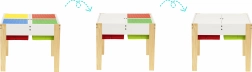 Dvobarvna, vrtljiva in odstranljiva plošča je sestavljena iz dveh delov: ena stran je združljiva s kockami in spodbuja ustvarjalno sestavljanje, druga pa je gladka za risanje, pisanje in ustvarjanje. Na sredini najdete 4 prostorne košare, v katere lahko otroci pospravijo kocke, barvice, papirje in knjižice – pospravljanje je tako stvar trenutka.