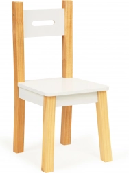V kompletu sta dva udobna stola z borovimi nogami in sediščem iz MDF. Mere so usklajene z mizo za udobno sedenje in pravilno držo.