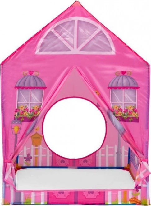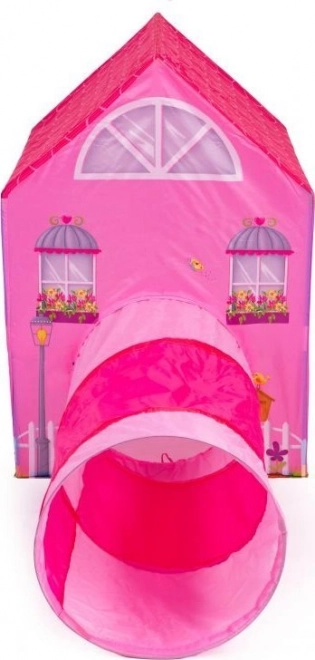 Otroški šotor s tunelom z motivom rožnate hišice.
