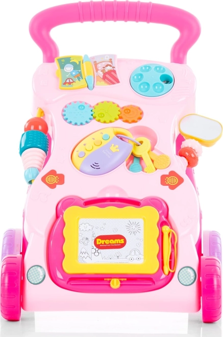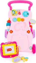 Del paketa so risalna tablica s pisalom, ogledalce, barviti zobniki, gumbi in ključi z “pametnim” upravljalnikom. Odstranljive igrače je mogoče uporabljati tudi samostojno, kar podaljšuje zabavo in spodbuja ustvarjalnost. Hodulja predvaja luči, melodije in zvoke, s čimer stimulira sluh, vid in koncentracijo. Pakirano v darilni škatli – odlična ideja za darilo.