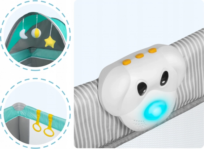 Praktična in varna potovalna posteljica za otroke s stranskim vhodom na zadrgo, dvema nivojema vzmetnice in bogato opremo. Ponuja sistem proti neželenemu zlaganju, mrežo proti insektom, kolesa z zavoro in previjalno mizico za maksimalno udobje na poti.