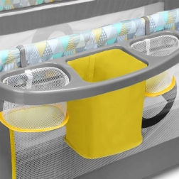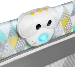 Bogata oprema vključuje previjalno mizico, visečo košaro za novorojenčka (2 višinski ravni), stranski panel s 3 žepi in mrežo proti insektom. Stranski vhod na zadrgo z varnostno ključavnico omogoča starejšim otrokom samostojen vstop in izstop. Za zabavo skrbijo melodije in interaktivni kužek, medtem ko kolesca z zavoro olajšajo premikanje v notranjih prostorih in na poti.
