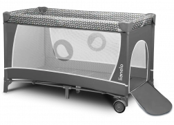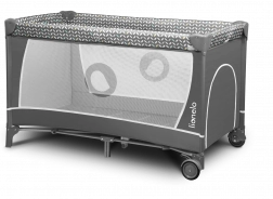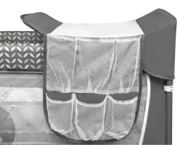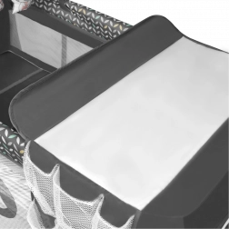 Varnost in udobje – LockGuard preprečuje nenamerno zlaganje konstrukcije, zaobljeni robovi ščitijo pred poškodbami, zračna mrežica na daljših straneh pa zagotavlja kroženje zraka in vizualni stik. Previjalni pult z dvignjenimi robovi in dvema žepoma ohranja potrebne pripomočke pri roki. Lok z igračami razvija motoriko in čute otroka.