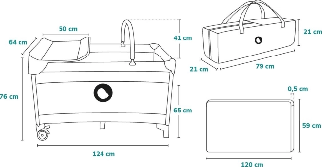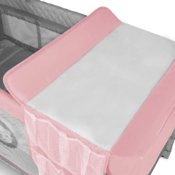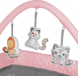 Vključuje previjalno mizico s povišanimi robovi, lok z igračami za razvoj čutov ter praktične žepe in predelke za potrebščine. Bočni vhod na zadrgo nudi starejšim otrokom samostojen dostop, mrežaste stranice pa zagotavljajo kroženje zraka in stalen nadzor.