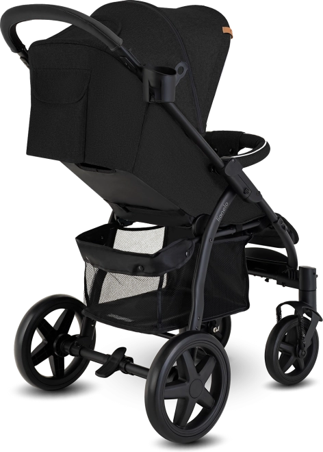 Brezvzdrževalna penasta EVA kolesa so neprebojna, sprednja se vrtijo za 360° z možnostjo blokade za vožnjo naravnost po neravni podlagi. Mehko vzmetenje blaži udarce, zanesljiva parkirna zavora drži voziček na mestu. Za varnost skrbijo 5-točkovni pasovi in odstranljiv varovalni lok; odsevni detajli povečujejo vidnost. Praktična košara, ergonomski ročaj iz eko usnja in dodatki v paketu naredijo Annet Plus idealno izbiro za aktivne družine.