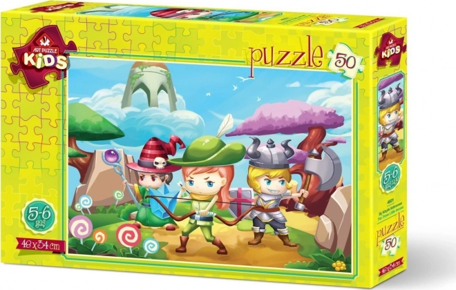 Odkrijte zabavo za najmlajše s kakovostno sestavljanko s 50 kosi, ki razvija logično razmišljanje, potrpežljivost in fino motoriko. Slikica »Trije mali junaki« bo razveselila otroke in starše, po sestavi pa meri približno 48 × 34 cm.