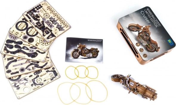 Leseni 3D puzzle WOODEN CITY Cruiser V-Twin ponuja avtentično izkušnjo gradnje mehanskega modela brez uporabe lepila ali orodja. Ta model je narejen iz ekološke brezove vezane plošče in vsebuje funkcionalne podrobnosti pravega motocikla. Model motocikla ponuja: