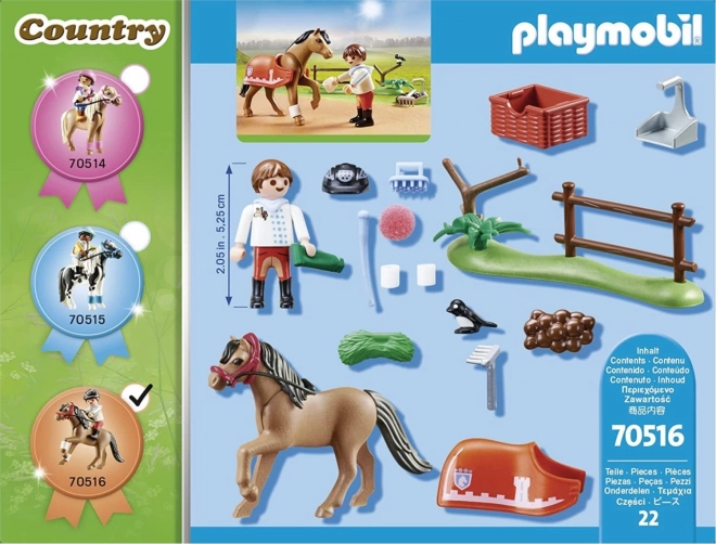 Ta podrobno izdelan set iz serije Playmobil Country predstavlja zgodbo dečka in njegovega ljubljenega ponija pasme Connemara. Otroci bodo uživali v vsakodnevni negi ponija – od pospravljanja potrebščin v rdečo škatlico do prekrivanja z odejo in čiščenja hleva.