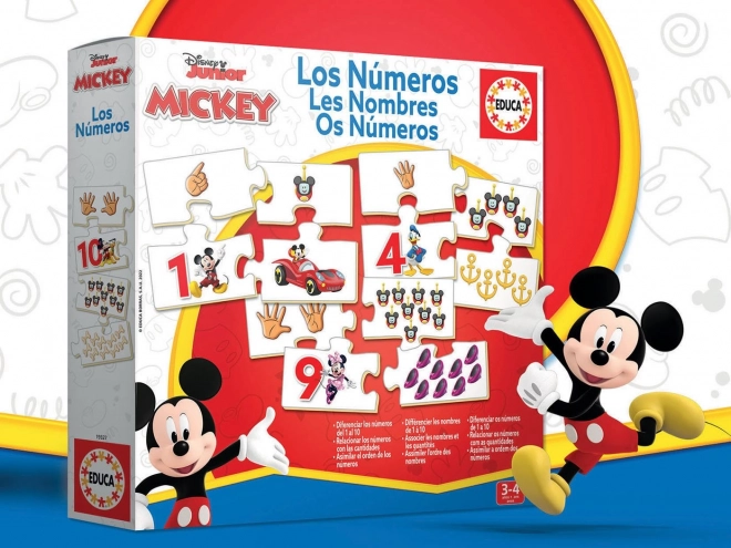 Zabavna in izobraževalna sestavljanka za najmlajše z motivi iz priljubljene serije MICKEY IN PRIJATELJI. Komplet vsebuje deset samostojnih slik po štiri koščke, ki otrokom pomagajo učiti se števil od 1 do 10. Spodbuja koordinacijo oko–roka, logično razmišljanje in prepoznavanje barv in predmetov.
