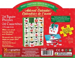 Adventni koledar EUROGRAPHICS »Sladke počitnice« spremeni december v igrivo tradicijo. Vsak od 24 predalčkov skriva kvadratno sestavljanko s 50 koščki z okusnimi motivi slaščic. Slikice merijo 12,5 × 12,5 cm, predloga pa je natisnjena na zadnji strani vsakega predalčka za lažje sestavljanje.