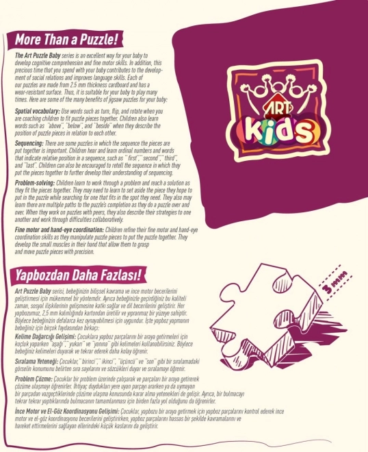 Odkrijte zabaven in poučen svet z Art Kids Baby Puzzle Živali! Te sestavljanke ne nudijo le zabave, temveč tudi spodbujajo razvoj pomembnih veščin pri otrocih: