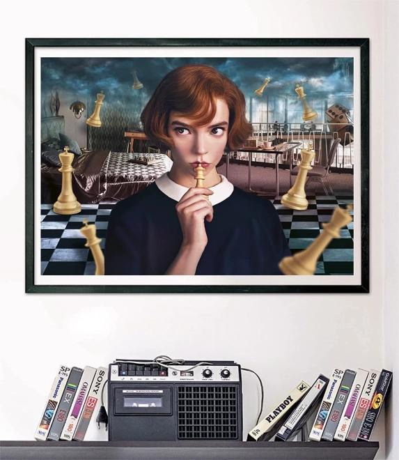 Stilska sestavljanka z motivom serije Netflix: Damin gambit ponuja 1000 kosov za zabavno sestavljanje in dekorativen rezultat v približnih dimenzijah 70 × 50 cm. Idealno za ljubitelje šaha, dizajna in kakovostnih sestavljank.