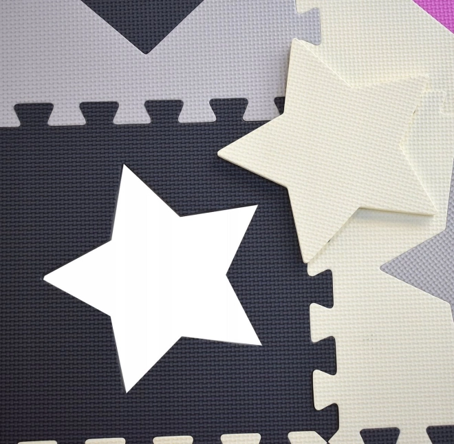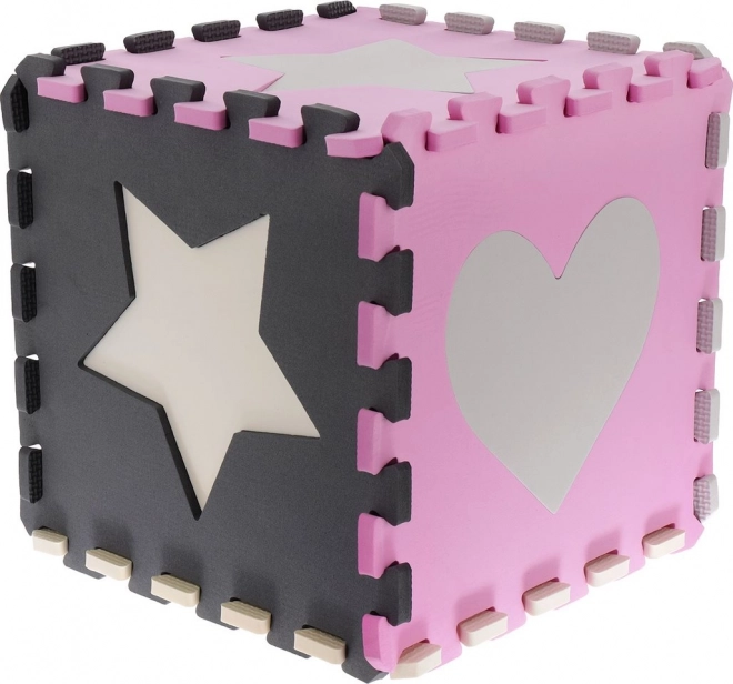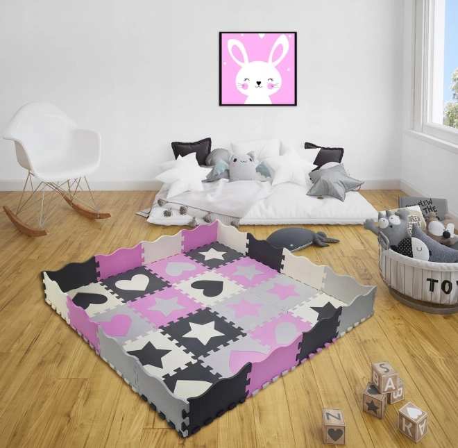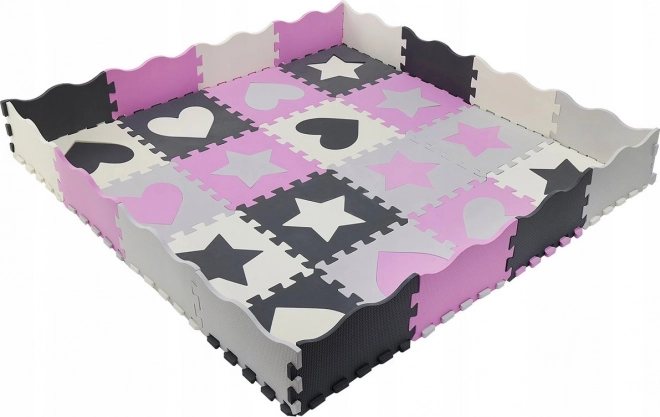 Pena puzzle podloga siva–rožnata z motivom src in zvezd 28 × 28 cm