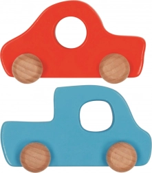 Komplet vsebuje dva lesena avtomobila, enega v rdeči in enega v modri barvi, ki podpirata otroško kreativnost in razvoj motoričnih spretnosti.