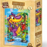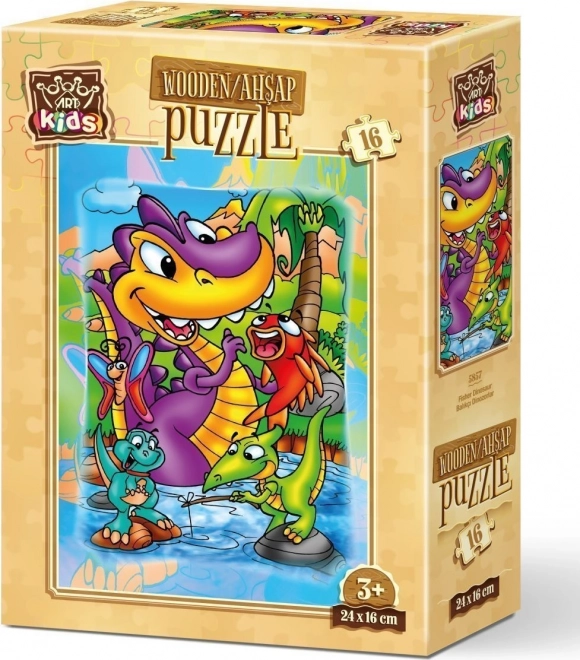 Zabavne lesene puzzle z motivom dinozavrov pri ribolovu bodo razveselile male graditelje in začetnike. Vsebujejo 16 trdnih kosov iz tanke lesene vezane plošče, po sestavi pa merijo pribl. 16 × 24 cm.